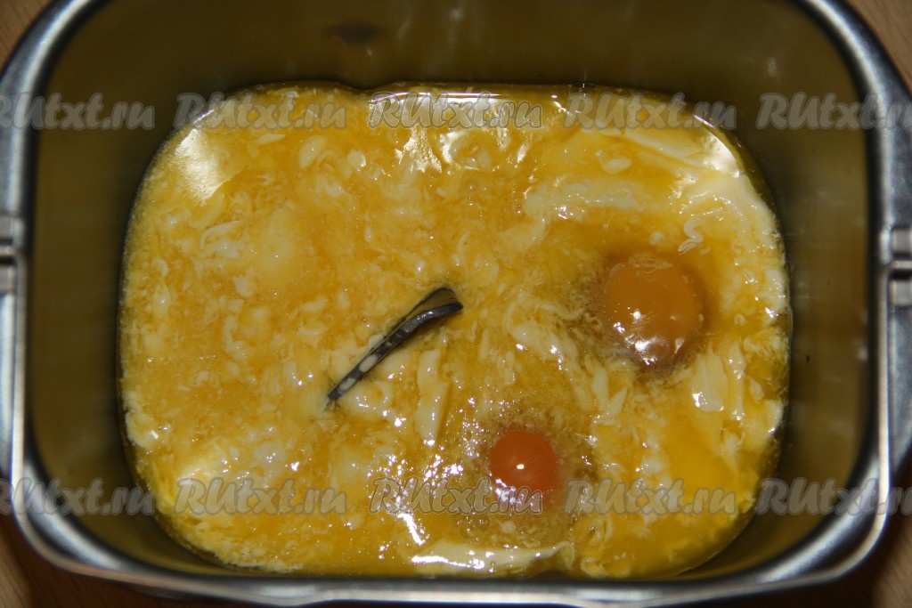 В ведёрко хлебопечки вылить молоко, добавить яйца, масло, сахар и соль.