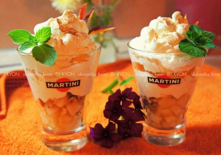 Перед подачей нежный, воздушный десерт, приготовленный из взбитых сливок и фруктов, можно немного охладить в холодильнике, а затем, по желанию, посыпать корицей, украсить по своему вкусу (я украсила веточками мяты и кусочками персика) и подать к столу.