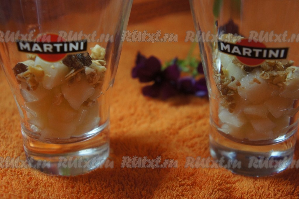 Формировать этот фруктово-сливочный десерт будем порционно. Грушу (или сочное яблоко) вымыть, очистить от кожуры, нарезать на мелкие кубики и равномерно разложить по стаканам или креманкам (я раскладывала по 2 стаканам).