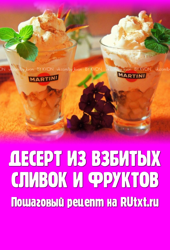 Фрукты часто ассоциируются с наслаждением, романтикой и нежностью. Именно поэтому, если вы хотите провести романтический вечер или приятно удивить внезапно заглянувших к вам гостей, или просто порадовать себя за вечерним просмотром телевизора, тогда советую приготовить сочный, нежный, воздушный десерт из взбитых сливок и фруктов. Рецепт предельно простой. Фрукты можно взять практически любые. Уверена, вкус этого десерта вам непременно понравится!