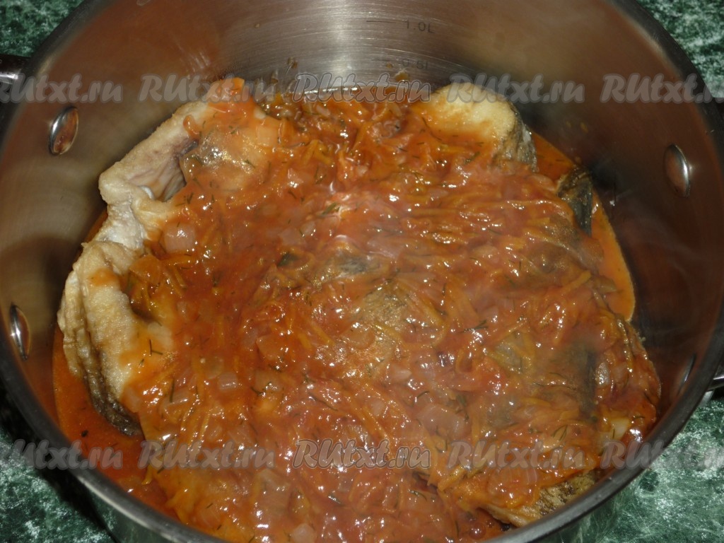Заливаем щуку томатным соусом и тушим на маленьком огне минут 25-30 минут (если соус будет слишком густой, добавьте немного воды).