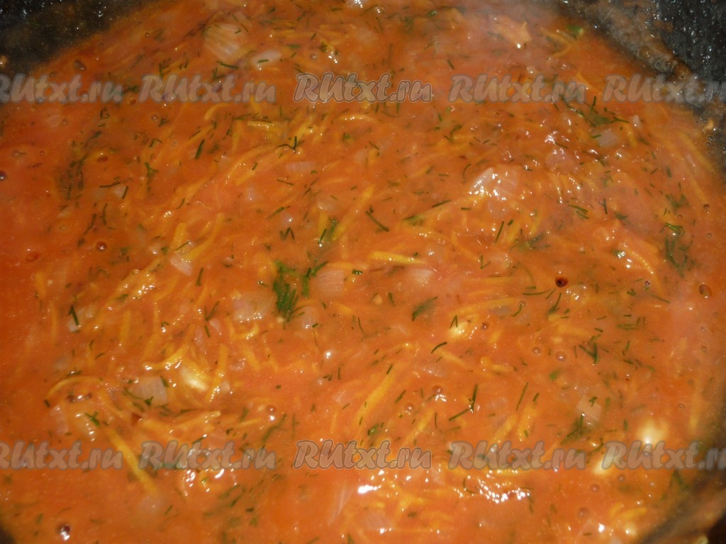 томатный сок и тушим минут 5. Затем получившийся томатный соус солим, перчим и добавляем порезанную зелень.