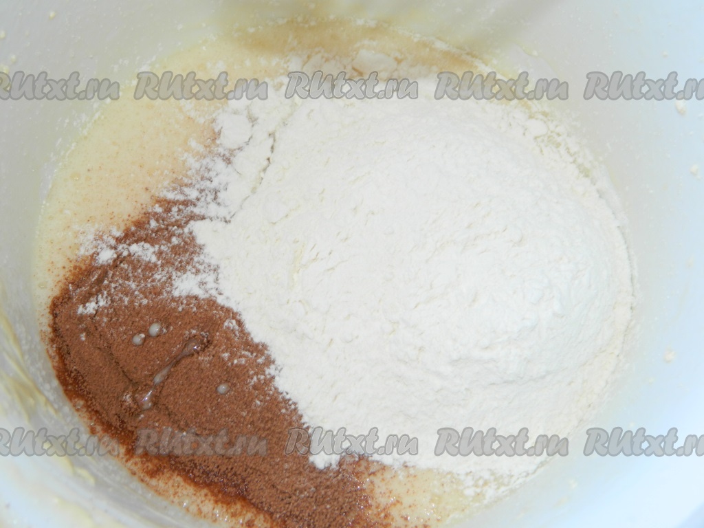 Добавляем муку, какао, соду и перемешиваем тесто.