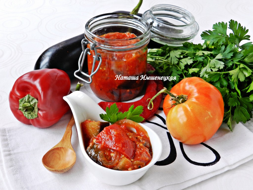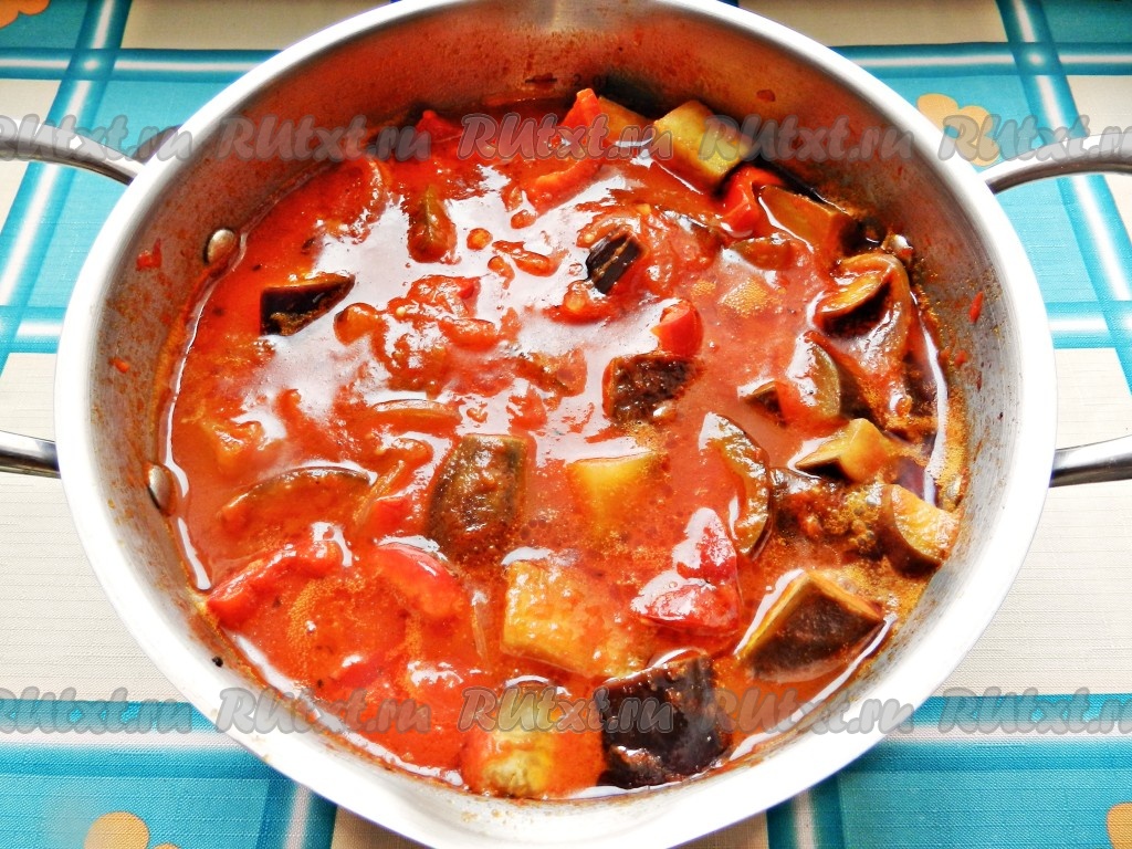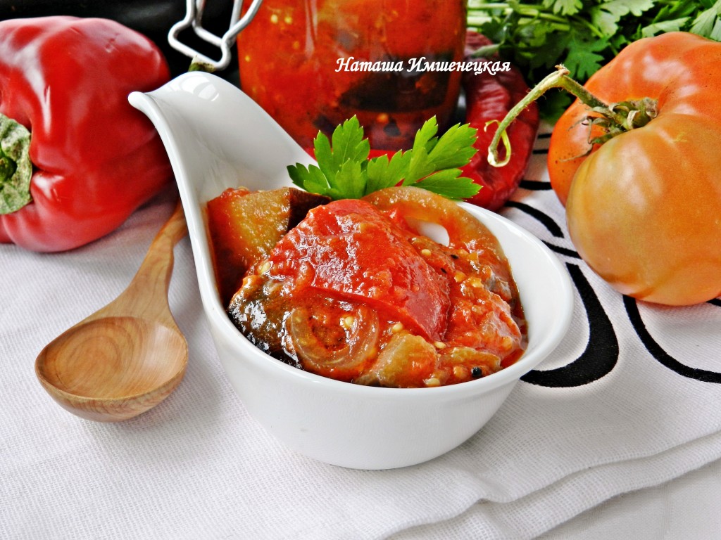 Вкусное и ароматное лечо с баклажанами и помидорами готово.