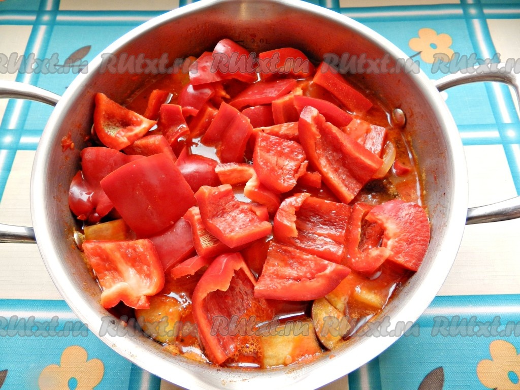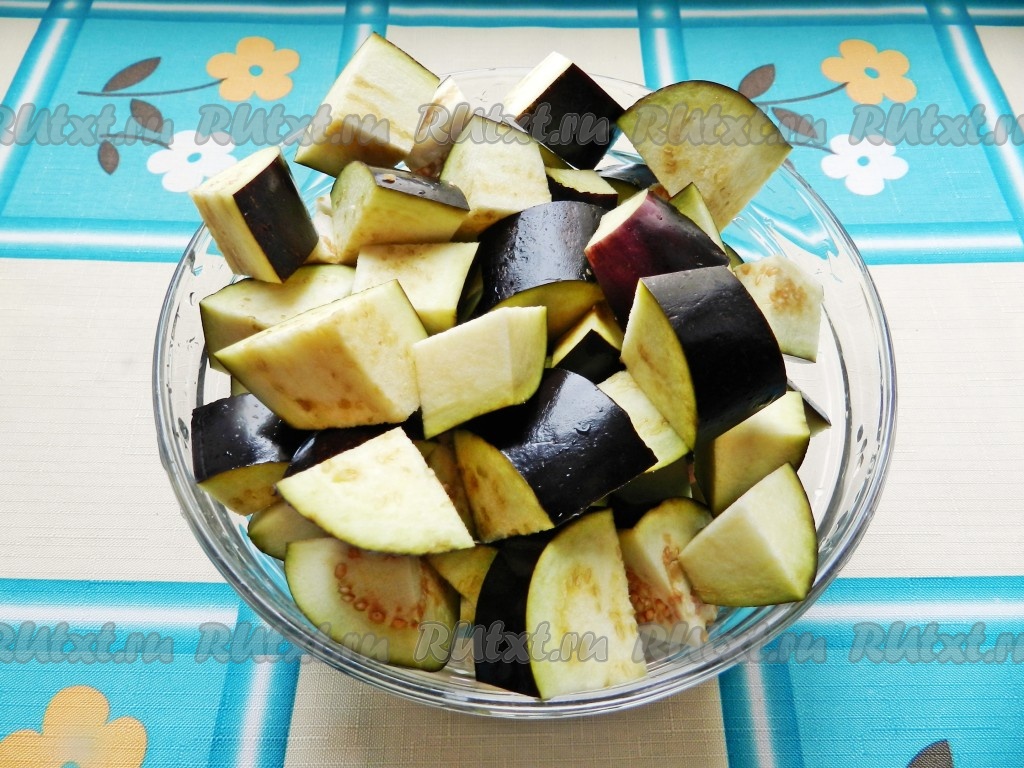Болгарский перец очистить и нарезать крупными кусочками, также как баклажаны - около 3 см.