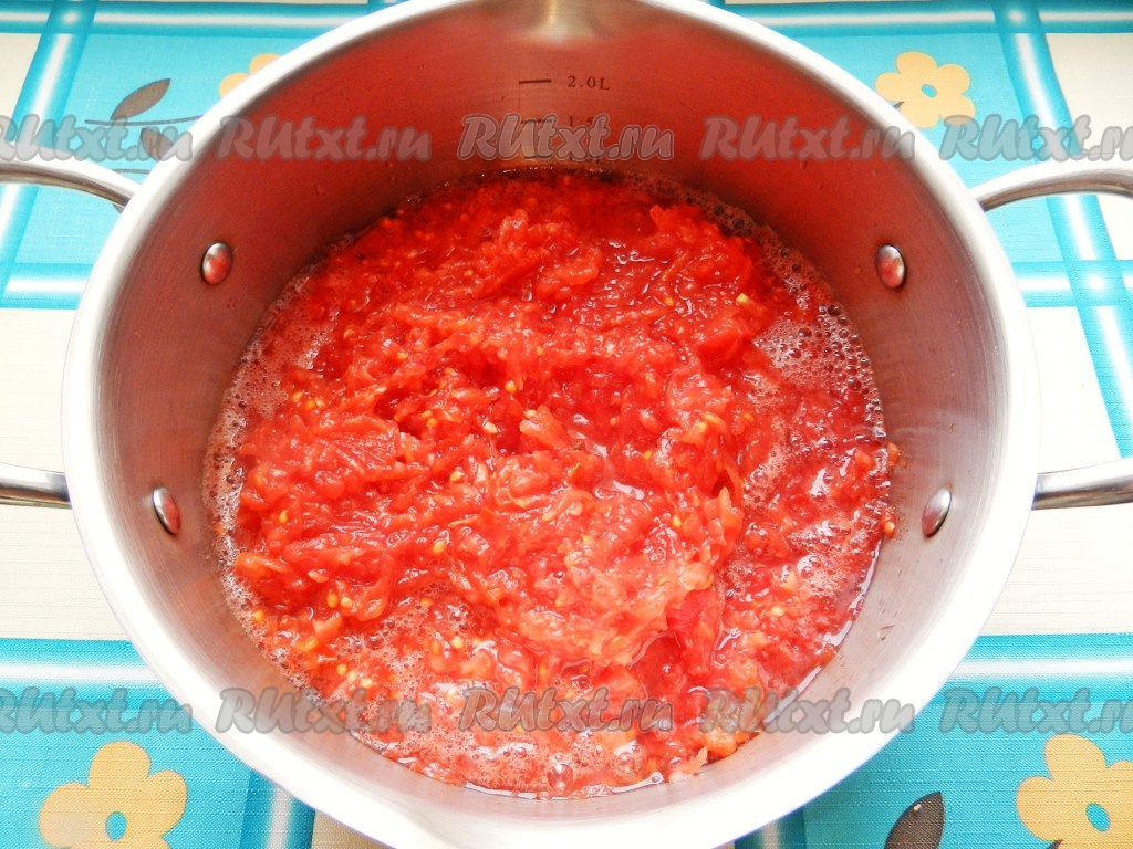 Должно получиться около 1 л томатного пюре. Кастрюлю с томатным пюре поставить на огонь и довести до кипения.