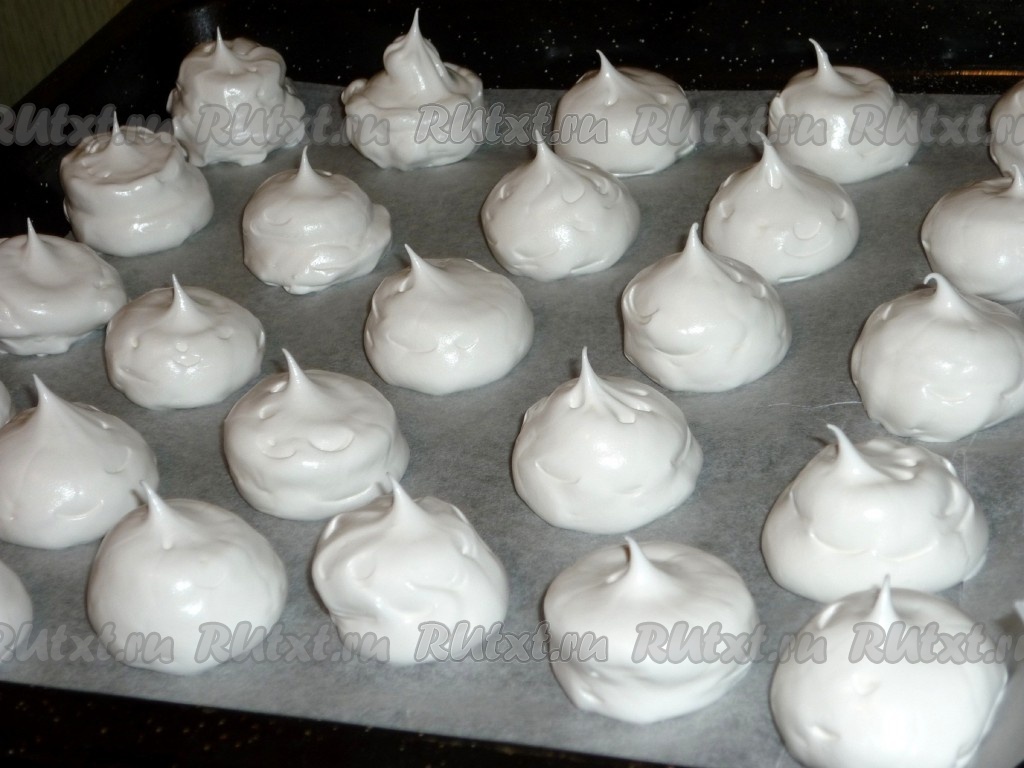 Массу, получившуюся в результате взбивания 4 белков с сахаром, перекладываем в кондитерский мешок и отсаживаем на противень, застеленный бумагой для выпечки. Если нет кондитерского мешка, тогда можно воспользоваться кондитерским шприцом или просто выложить безе при помощи столовой ложки. Ставим безе в холодную духовку. Включаем духовку с безе и нагреваем до 100-110 градусов, выпекаем 1-1,5 часа (духовку при выпекании не открываем).