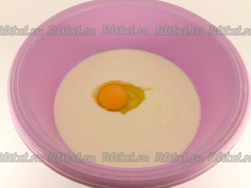 Кефир комнатной температуры влить в глубокую миску, добавить яйцо.
