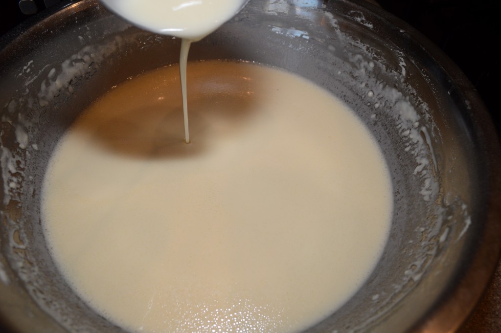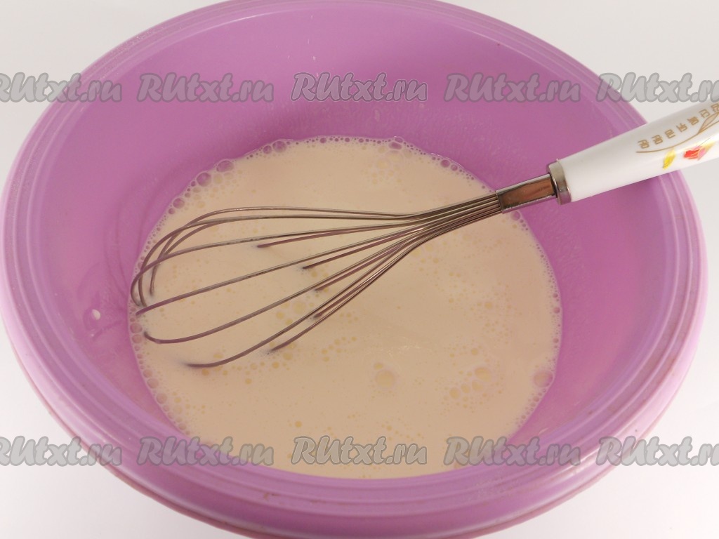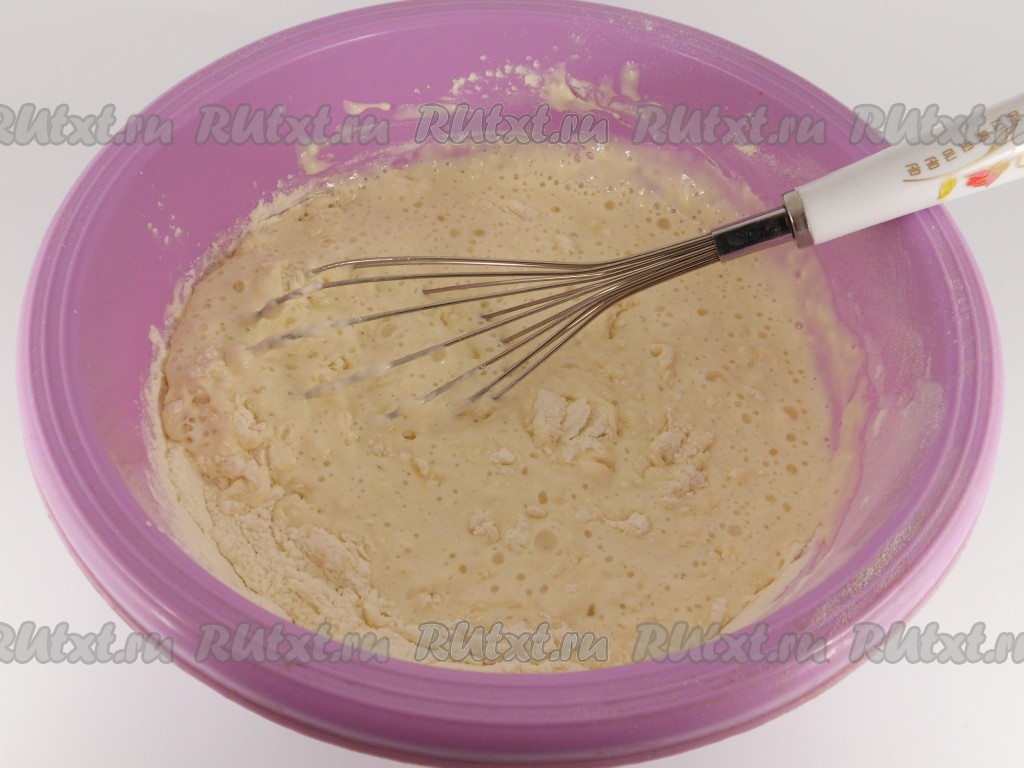 Постепенно всыпать просеянную муку. Замесить тесто, которое не должно быть слишком жидким, но и не должно быть густым. Добавляя муку, ориентируйтесь на консистенцию теста.