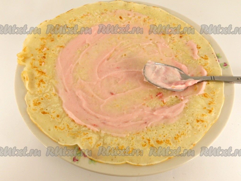 Готовые блины можно подавать к столу с вареньем, джемом, мёдом. А можно блины начинить любой начинкой (я смазала блинчики творожной массой).