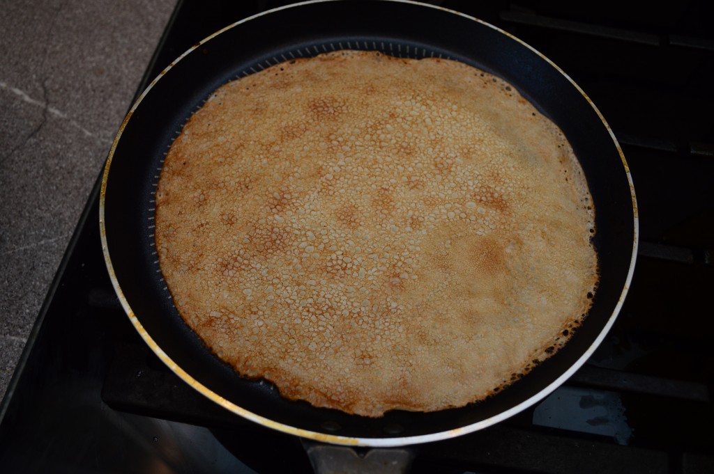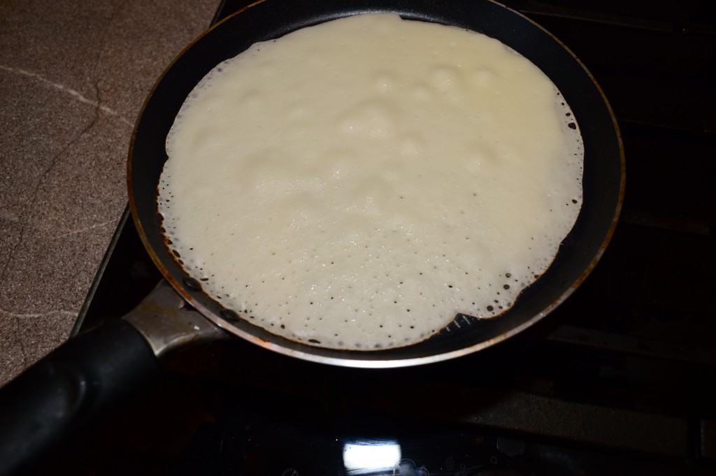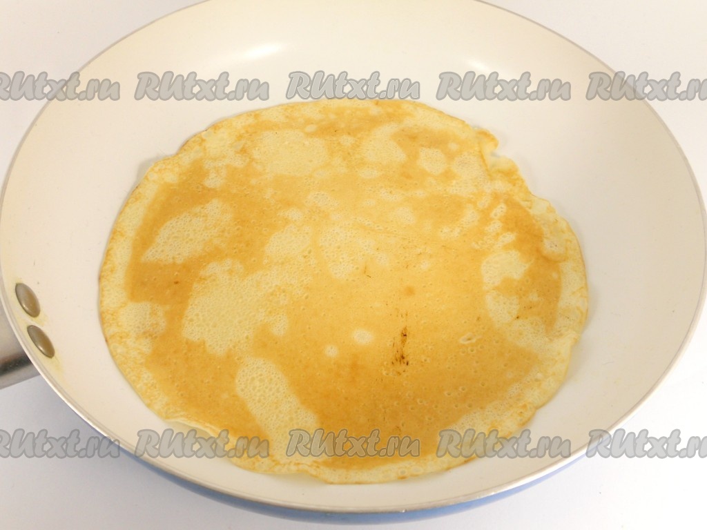 Жарить блины на разогретой сковороде, смазав её растительным маслом, обычным способом, с двух сторон на среднем огне.