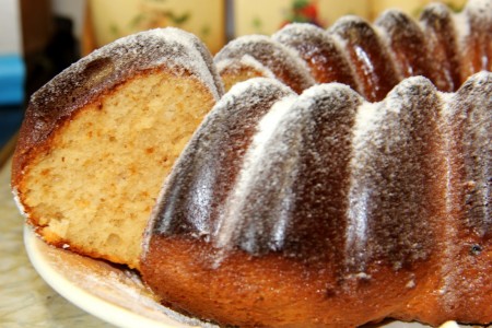 Чуть остывший кекс вынуть из формы, дать полностью остыть, а затем посыпать сахарной пудрой.