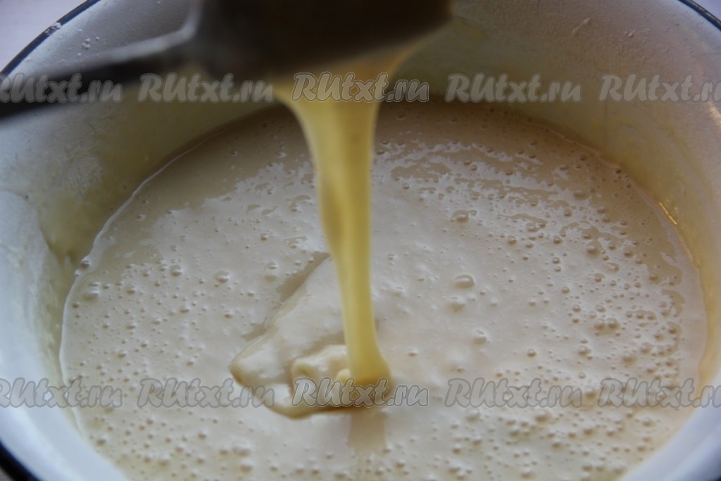 Яйца смешать со сгущенным молоком до однородности, затем влить растопленное не горячее сливочное масло, перемешать. В получившуюся смесь всыпать муку, просеянную с разрыхлителем, и ванильный сахар, очень хорошо перемешать. Тесто получится, как на фото, в меру густым.