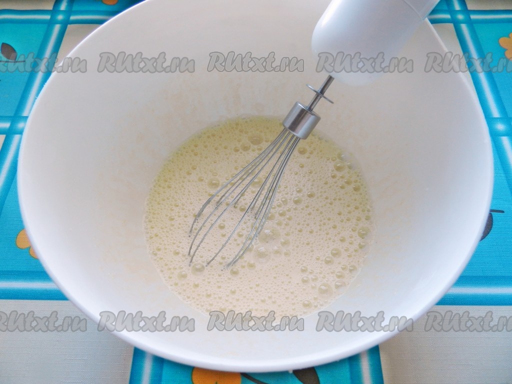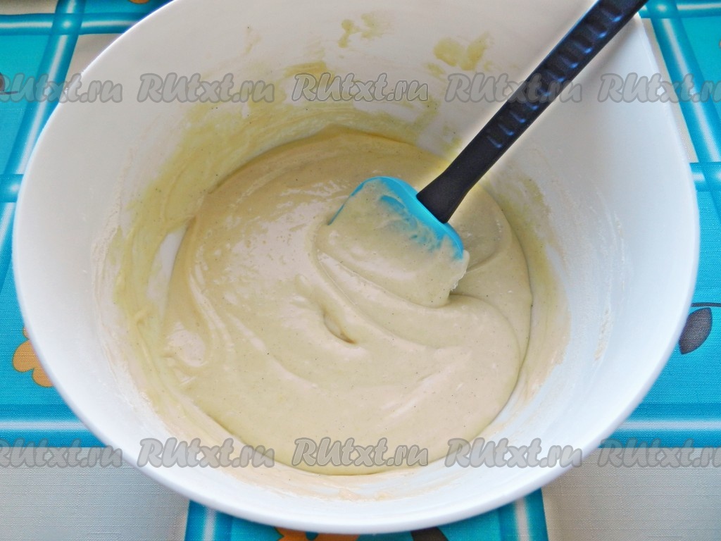 Муку смешать с разрыхлителем и постепенно добавить в тесто.