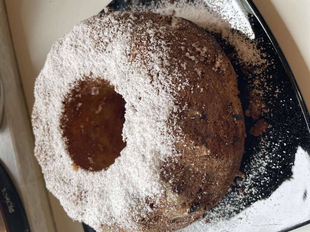 Готовый кекс остудить в форме, затем перевернуть на решетку, посыпать сахарной пудрой.