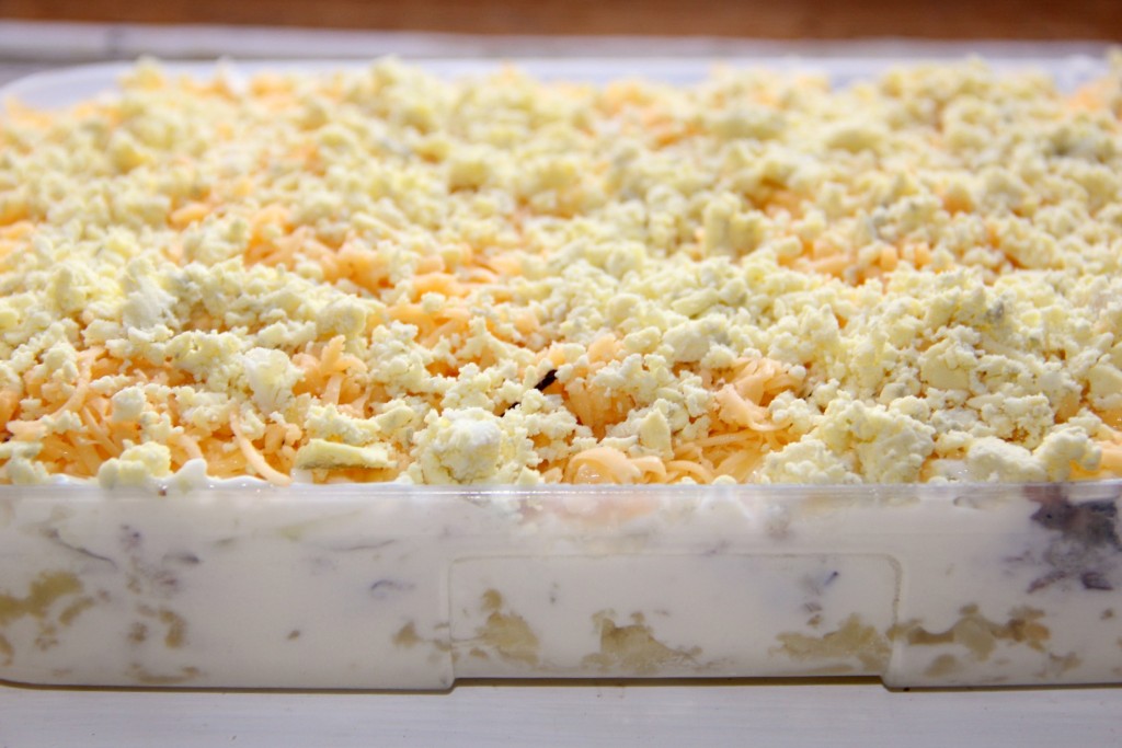 Предварительно замороженное сливочное масло натереть на крупной тёрке, выкладывая равномерно следующим слоем. Очищенные яйца разделить на желтки и белки. Белки натереть на крупной тёрке и выложить следующим слоем салата, при желании можно немного подсолить. Слегка смазать этот слой майонезом.