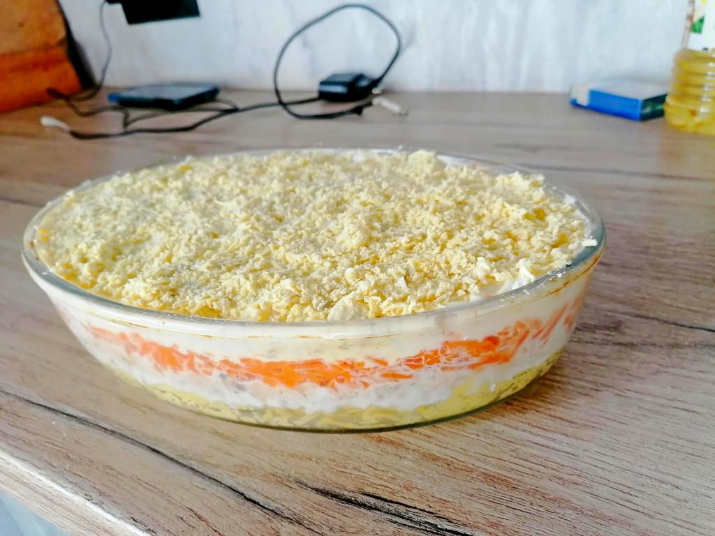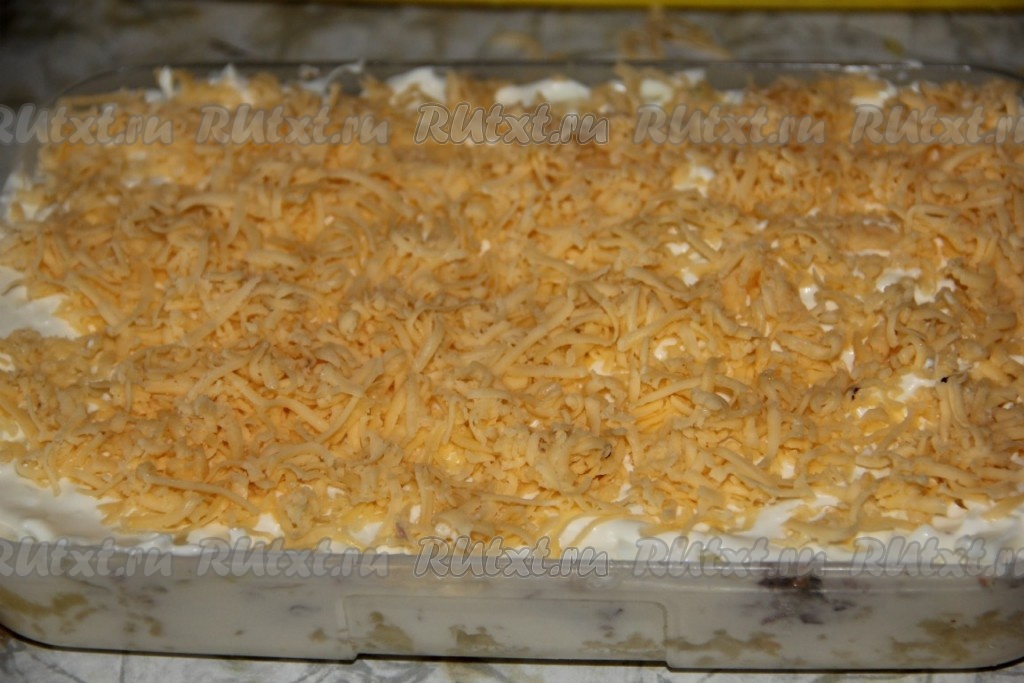 Следующим слоем разложить варёную морковку, натёртую на крупной тёрке, смазать немного майонезом. Затем выложить слой сыра, натёртого на крупной тёрке, нанести небольшой слой майонеза.