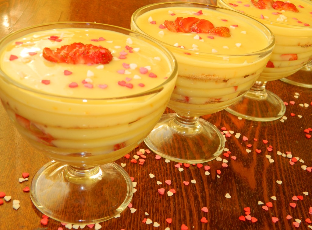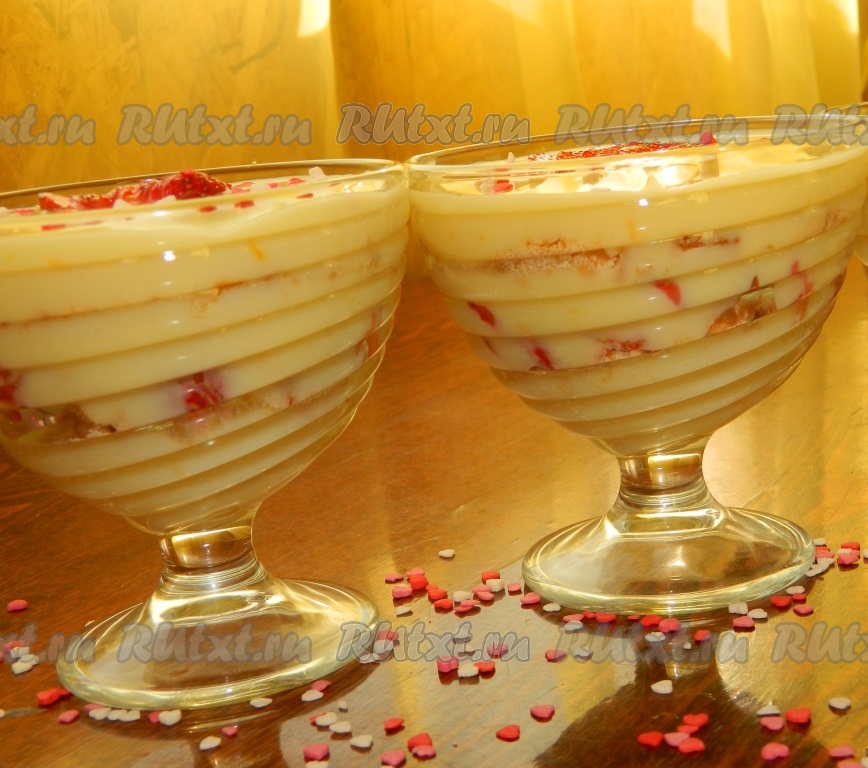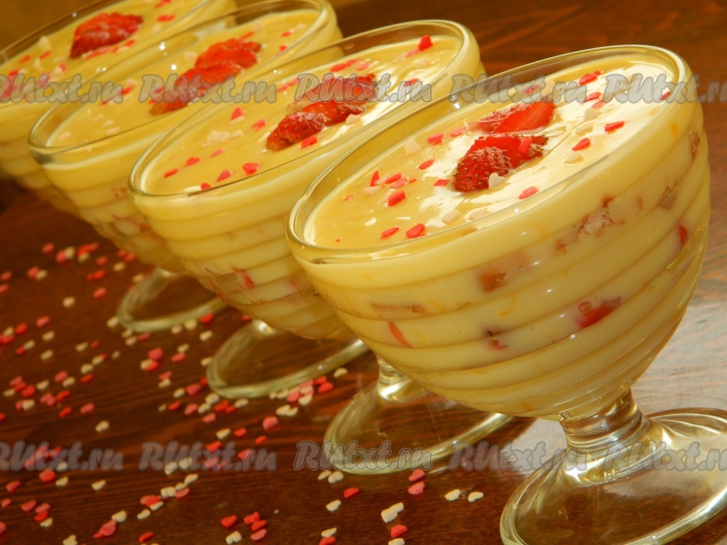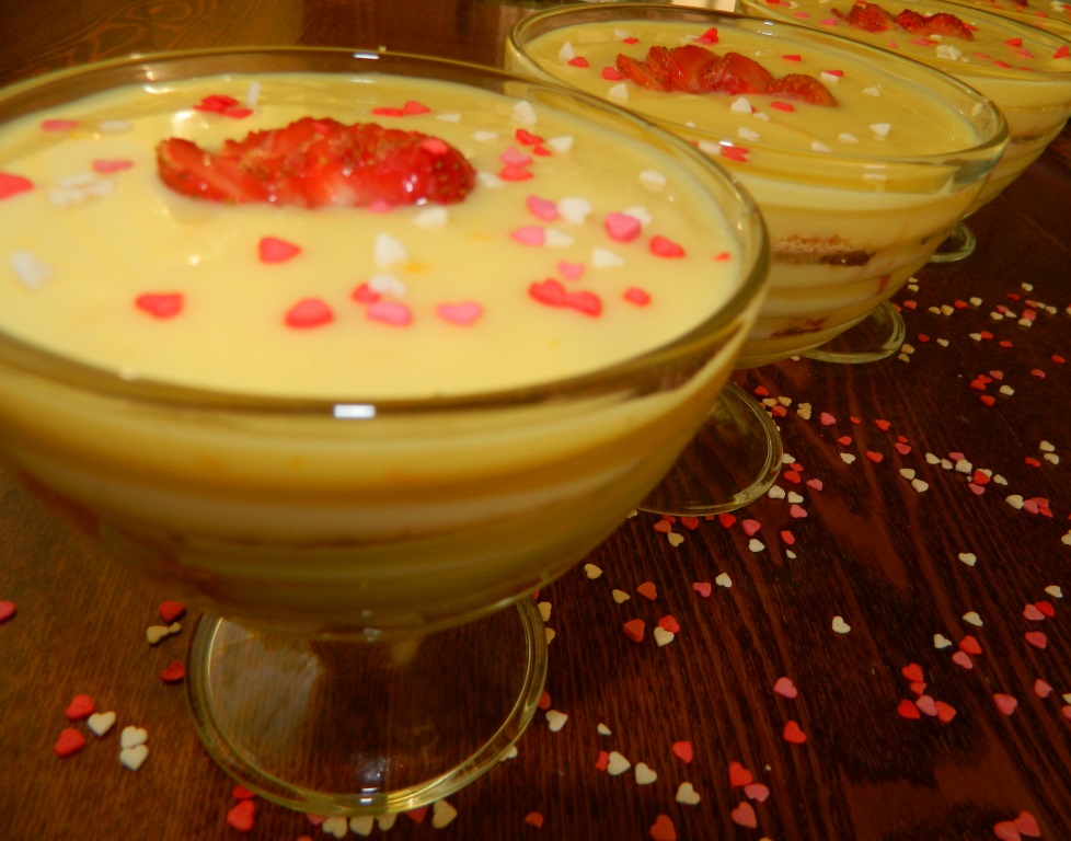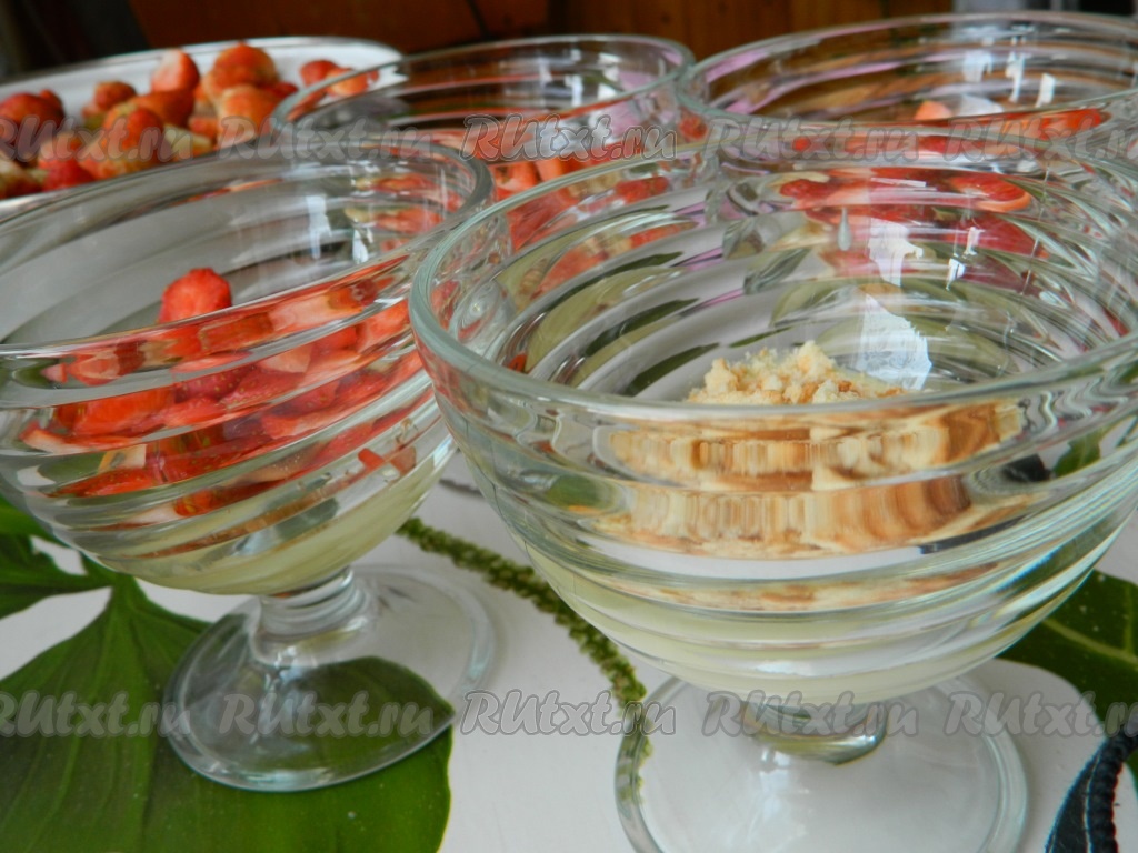Начинаем формировать десерт, выкладывая его слоями. На дно креманок выкладываем слоями: немного тёплого апельсинового крема; печенье; нарезанные ягоды клубники; опять выкладываем тёплый крем, печенье и сверху все заливаем кремом. Слои можете делать по своему вкусу. Украшаем десерт ягодкой клубники. Креманки убираем в холодильник для остывания и пропитывания печенья.