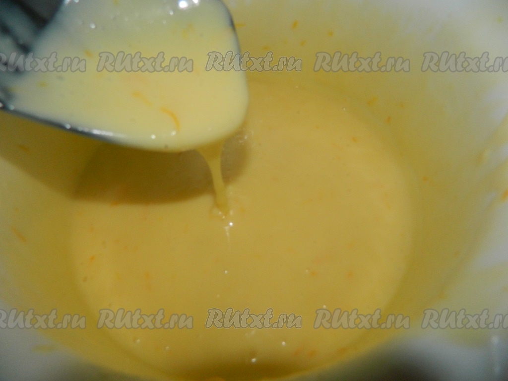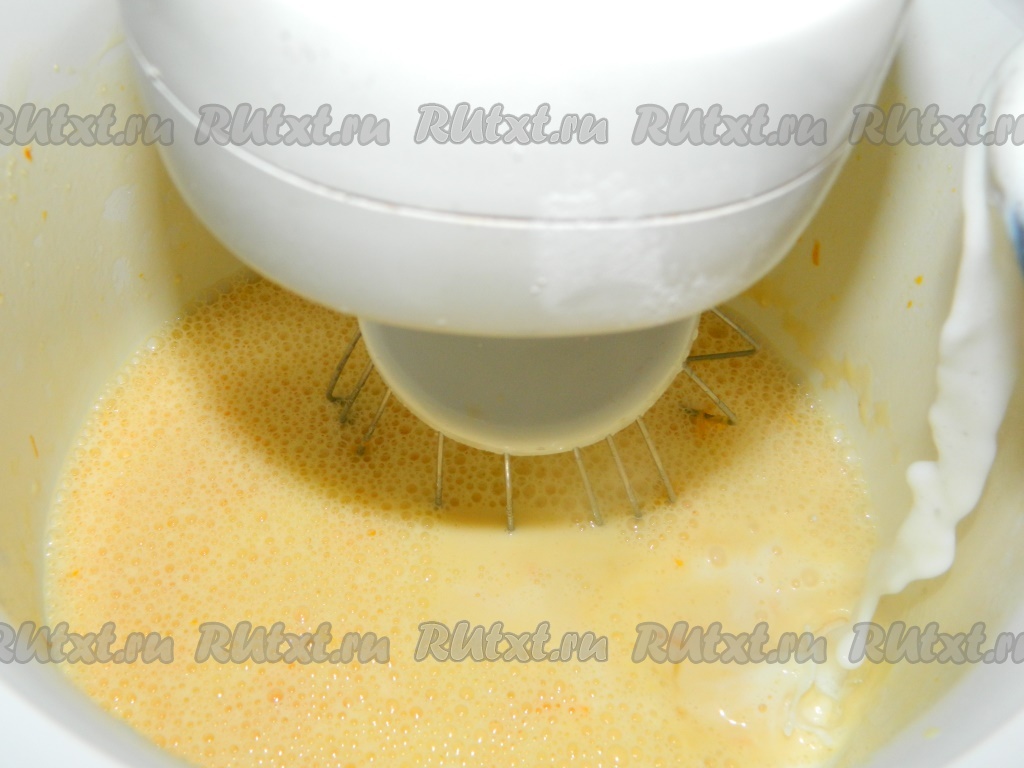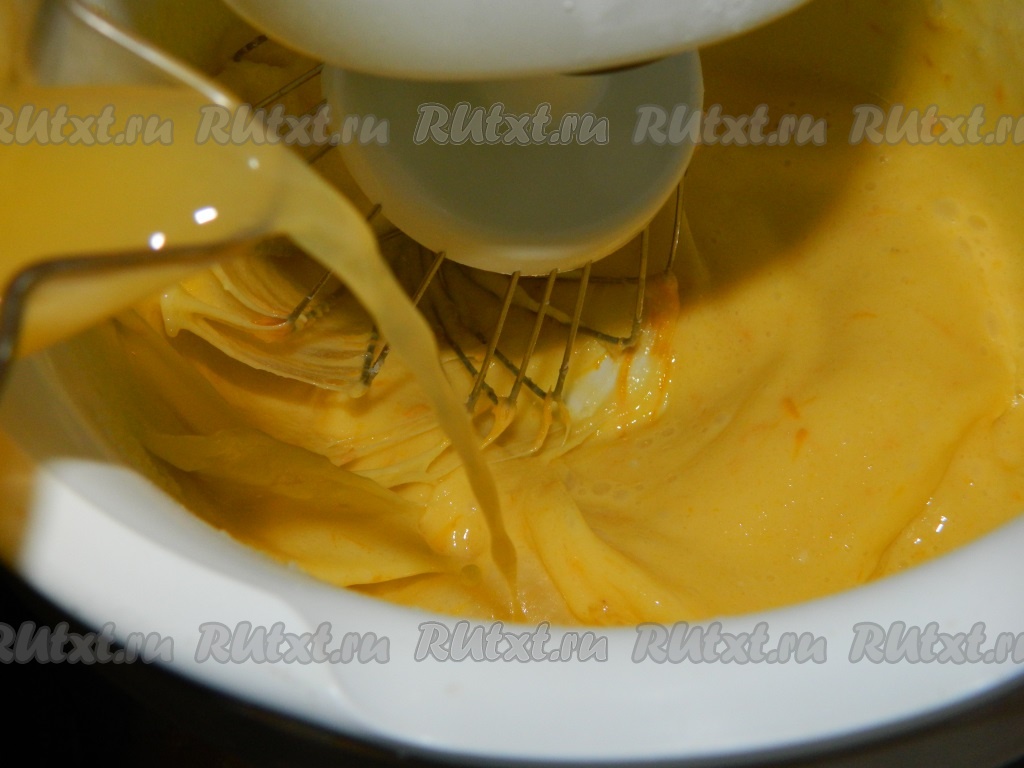 В постоянно перемешиваемую яичную смесь вливаем апельсиновый сок.
