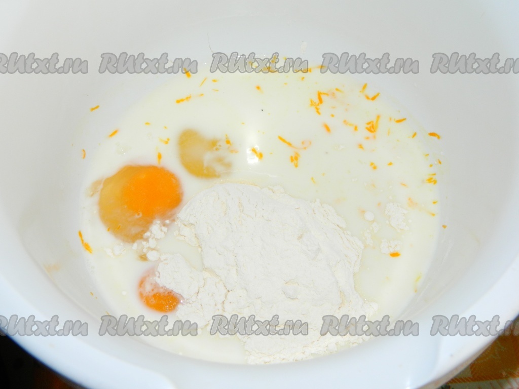 Муку, яйца, цедру, сахар смешиваем с небольшим количеством молока (чтобы не было комочков). Оставшееся молоко ставим на огонь, чтобы оно закипело.
