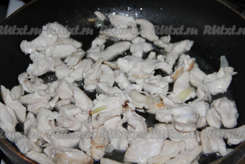 Куриное филе моем, обсушиваем, нарезаем на небольшие кусочки, солим. В сковороде разогреваем растительное масло, выкладываем нарезанное мясо и обжариваем на среднем огне минут 5-7 (до изменения цвета со всех сторон), иногда помешивая.