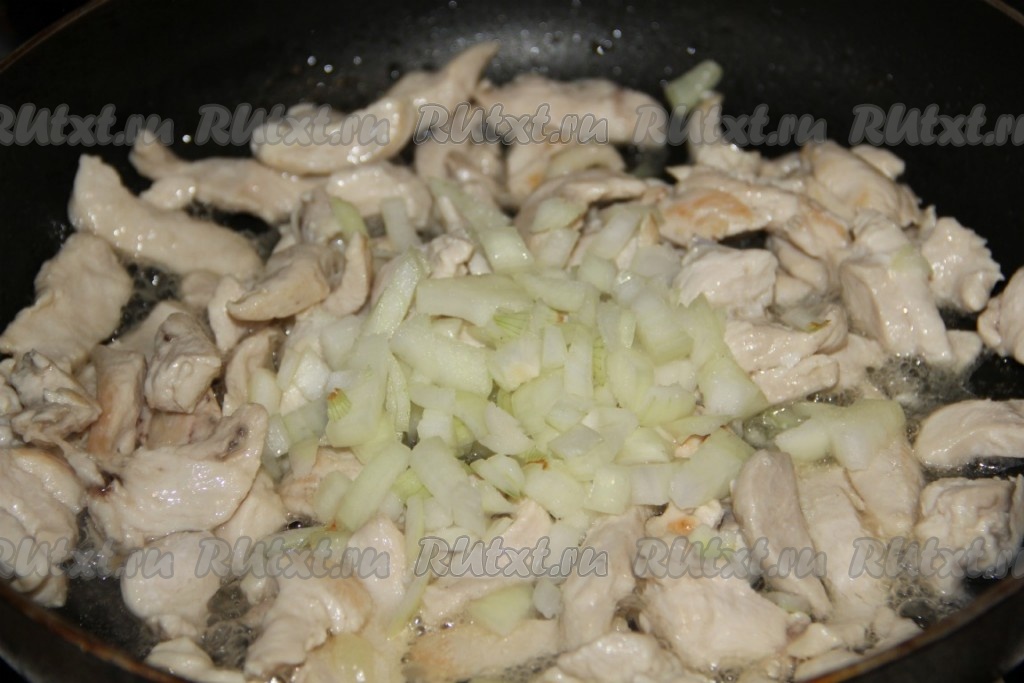 К обжаренному куриному филе выкладываем очищенный и мелко нарезанный лук, перемешиваем. Обжариваем минуты 3 (до прозрачности лука), иногда перемешивая.
