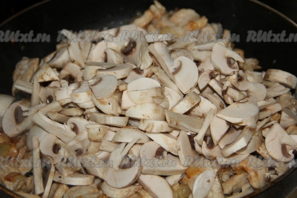 Шампиньоны моем, немного обсушиваем, нарезаем на небольшие ломтики. После того как лук станет прозрачным, добавляем в сковороду нарезанные шампиньоны, перемешиваем. Обжариваем грибы с куриным филе минут 8-10, накрыв сковороду крышкой, иногда помешивая.