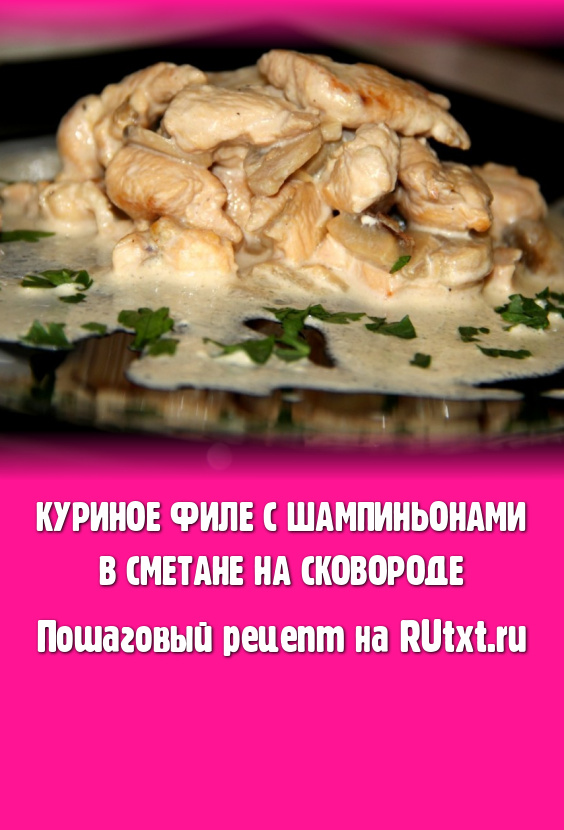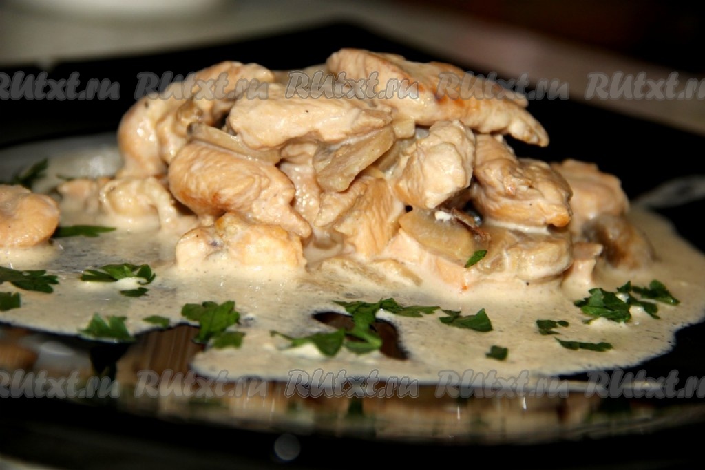 Куриное филе с шампиньонами раскладываем со сковороды по тарелкам и подаём к столу с гарниром, поливая соусом из сметаны, в котором тушились мясо и грибы.