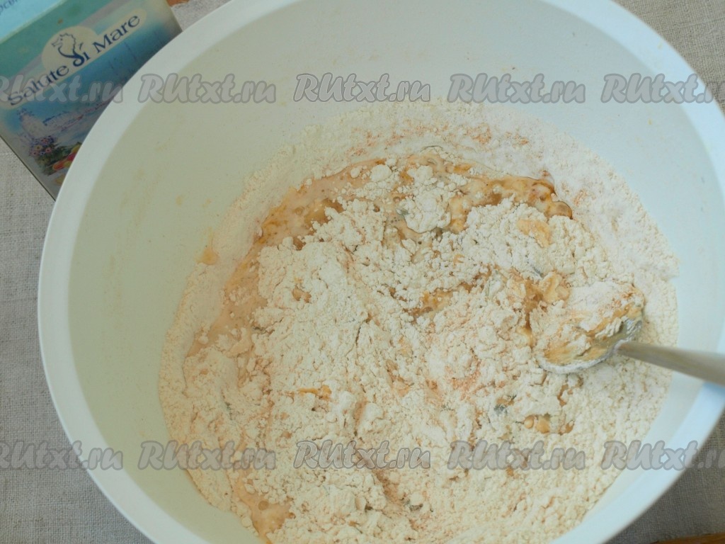 В объёмную миску просеиваем муку, добавляем соль и карри, перемешиваем. Всыпаем 30 грамм очищенных семечек и сухие дрожжи, перемешиваем. Затем вливаем тёплую воду (её температура должна быть 38-40 градусов) и растительное масло, перемешиваем тесто вначале ложкой.