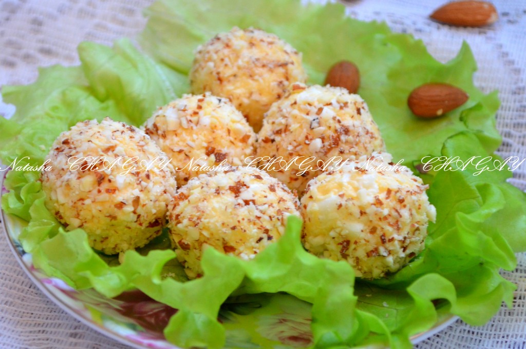 Несколько орешков измельчить в мелкую крошку для обваливания. Из сырно-яичной массы сформировать маленькие шарики, внутрь положить орешек. Обвалять закусочные шарики со всех сторон в измельчённых орехах.