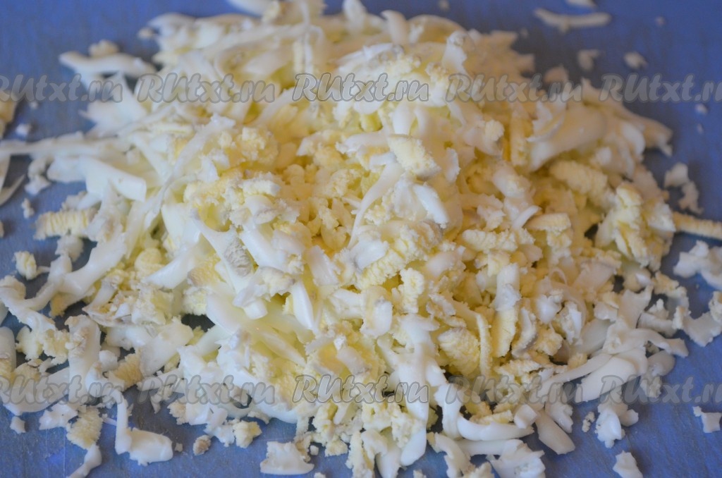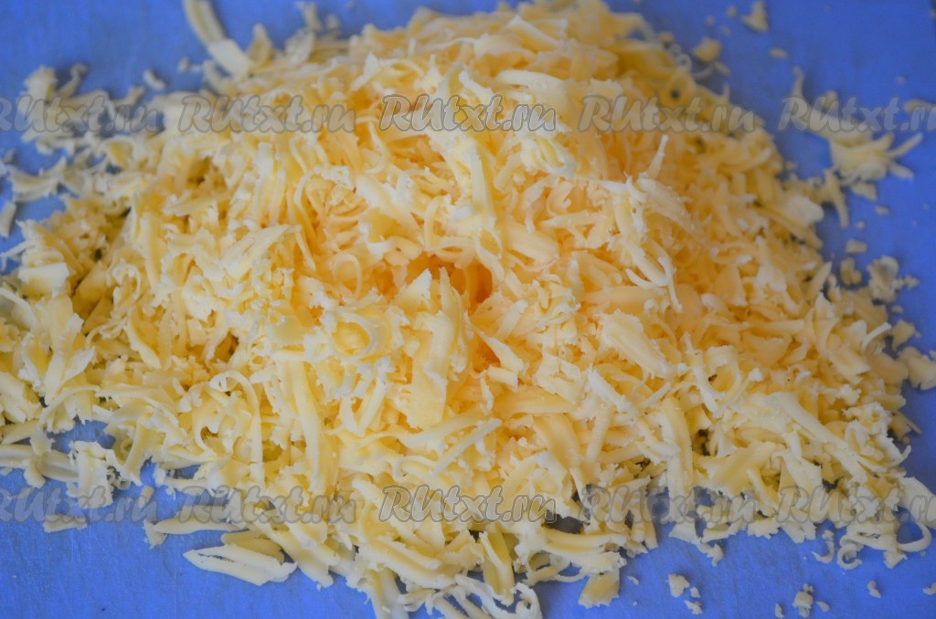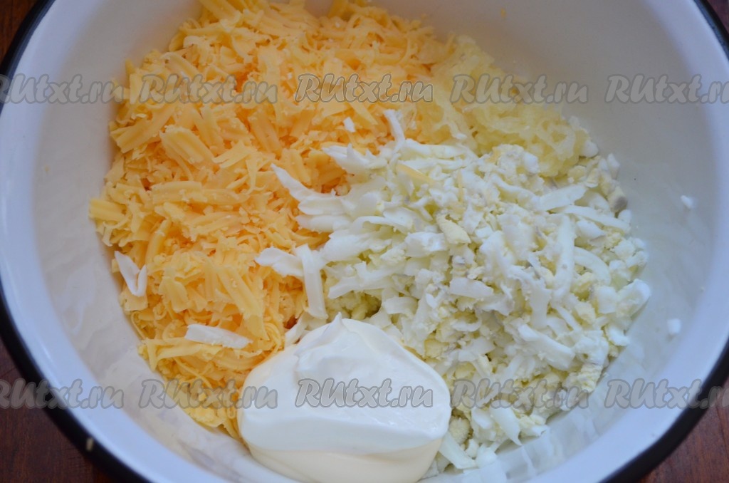 Яйца сварить вкрутую (на отваривание потребуется с момента закипания воды минут 9-10), затем полностью их остудить и очистить. Сыр натереть на средней (или мелкой) тёрке.