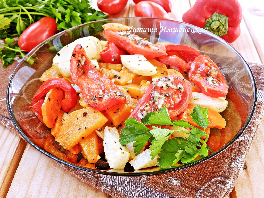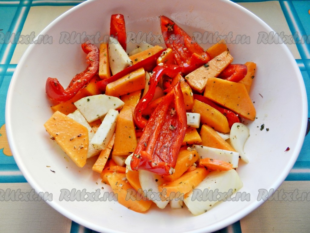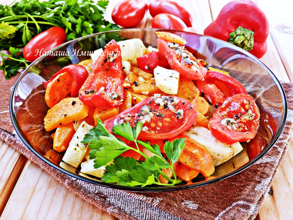 Противень застелить бумагой для выпечки, выложить овощи в один слой, добавить к ним половинки помидоров, смазанные маслом, смешанным со специями. Поставить противень в разогретую до 190 градусов духовку на 25 минут. По прошествии этого времени тыква, сельдерей и морковка должны легко прокалываться ножом, если эти овощи прокалываются ещё плохо, тогда продолжайте запекать ещё минут 5-10 (до готовности овощей). В конце приготовления можно включить в духовке режим "Гриль". Готовые запечённые овощи переложить в тарелку, с перцев и помидоров предварительно снять кожицу, аккуратно перемешать овощное рагу.