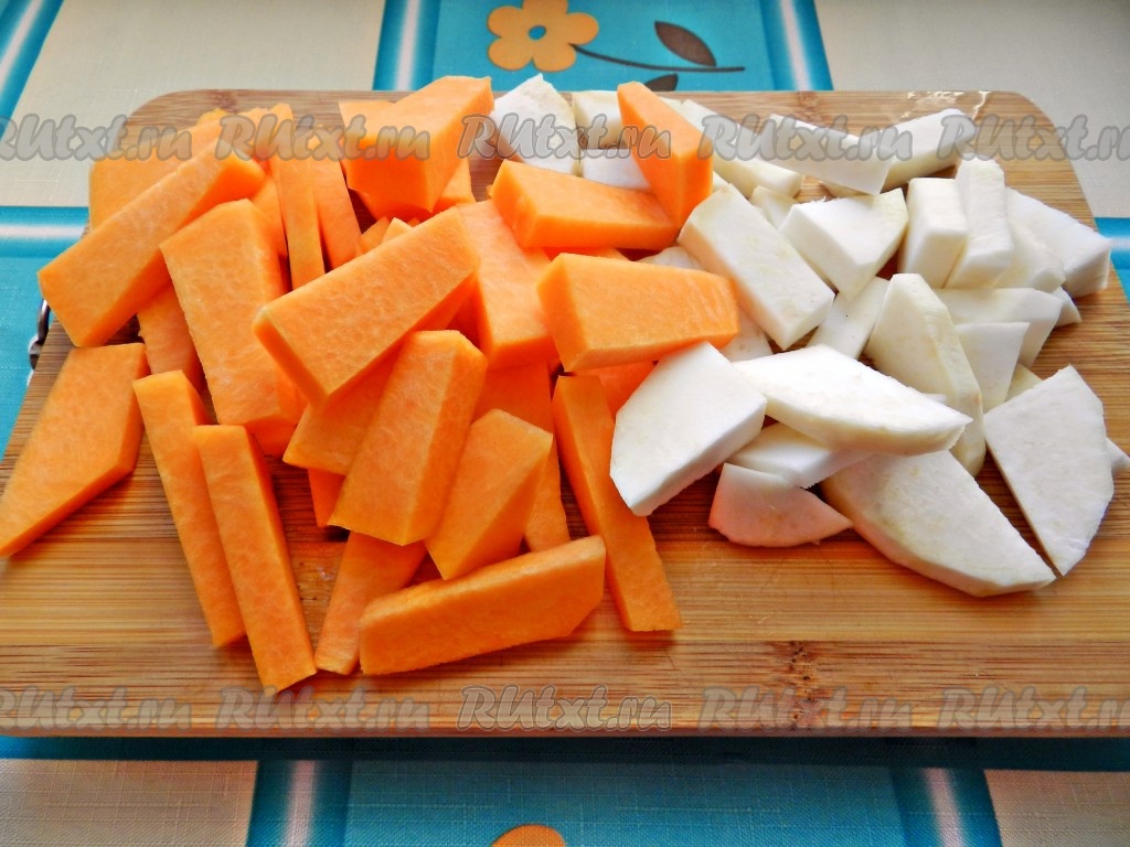 Тыкву и сельдерей нарезать на тонкие брусочки.