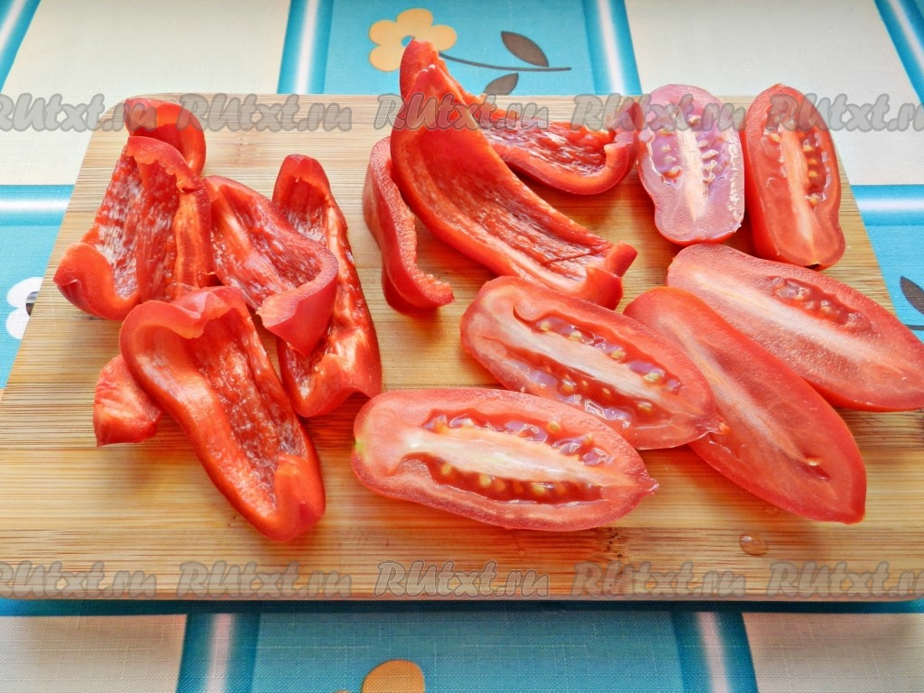 Перец очистить от семян и перегородок, нарезать полосками, помидоры разрезать пополам.