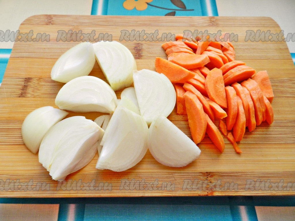 Лук нарезать на крупные кусочки, морковь - на тонкие полукружочки.