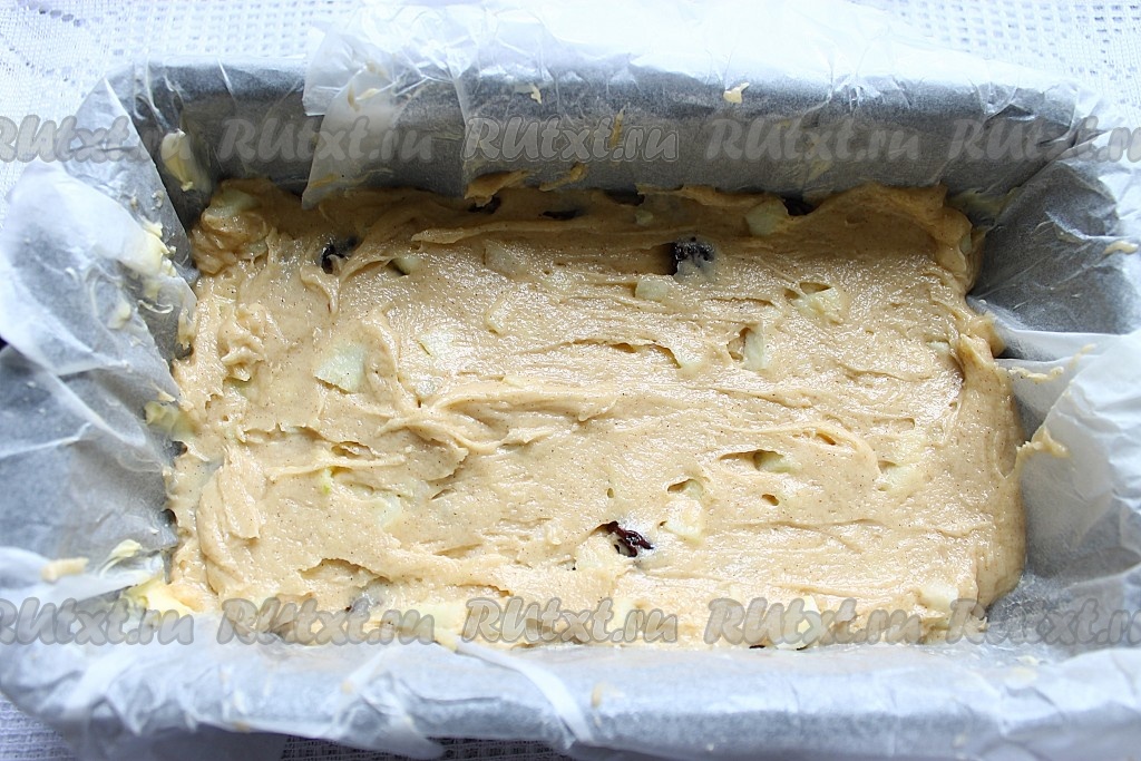 Форму для выпечки (у меня прямоугольная 12х21 см) застелить промасленным пергаментом, выложить тесто, разровнять. Сверху на тесто выложить крупно порубленные орехи, слегка их вдавить в тесто.