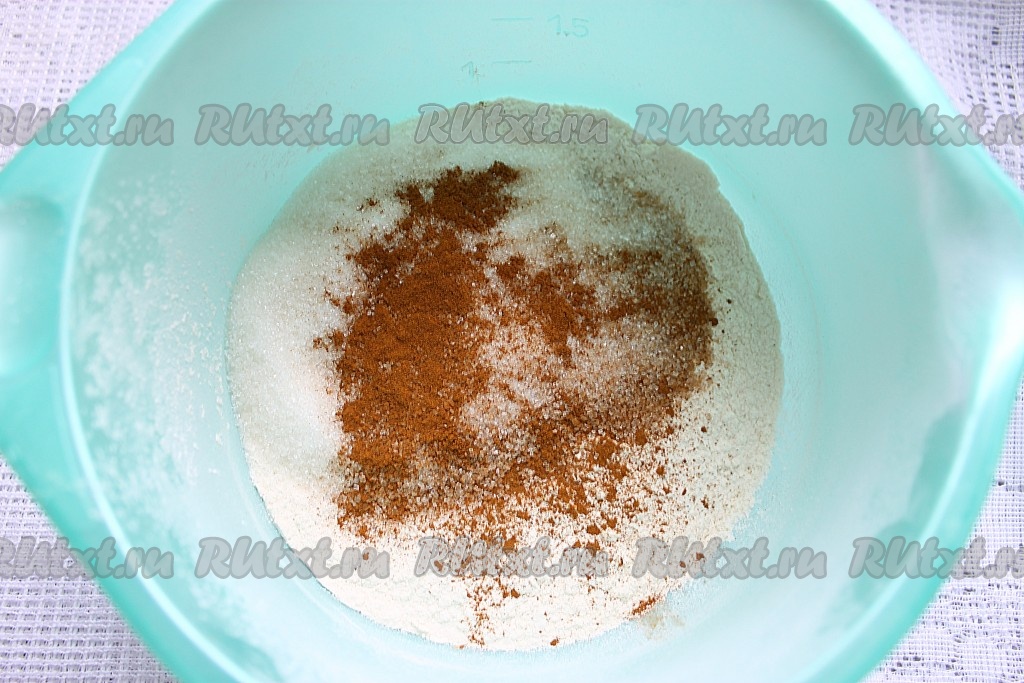 Духовку разогреть до 160-170 градусов. Муку и разрыхлитель просеять в миску, добавить сахар и корицу, перемешать.