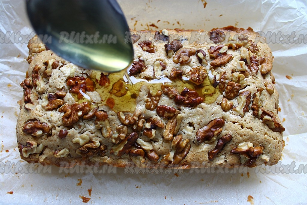 Готовый кекс достать, выложить вместе с пергаментом на блюдо или разделочную доску, сверху полить 1 столовой ложкой мёда. Кекс полностью охладить.