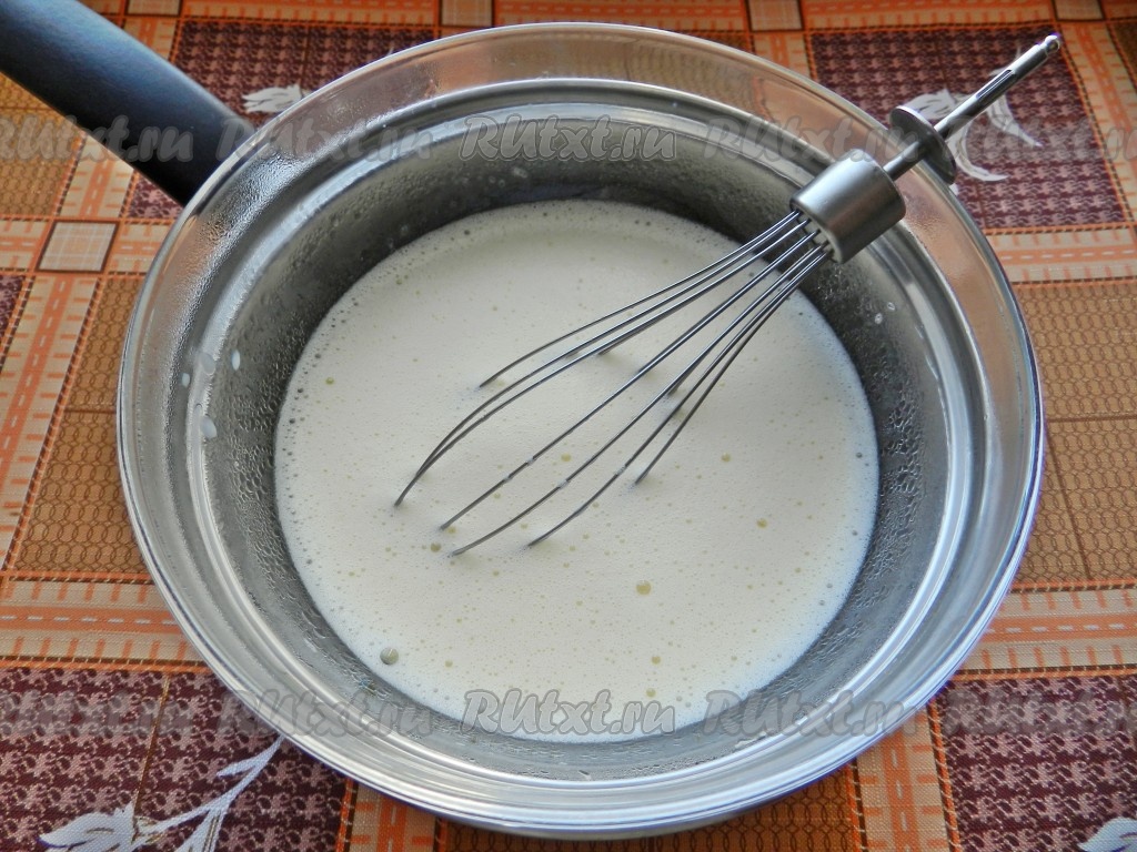 Молоко нагреть до кипения. Небольшими порциями вливать горячее молоко в желтки, сразу размешивая, чтобы они не свернулись.