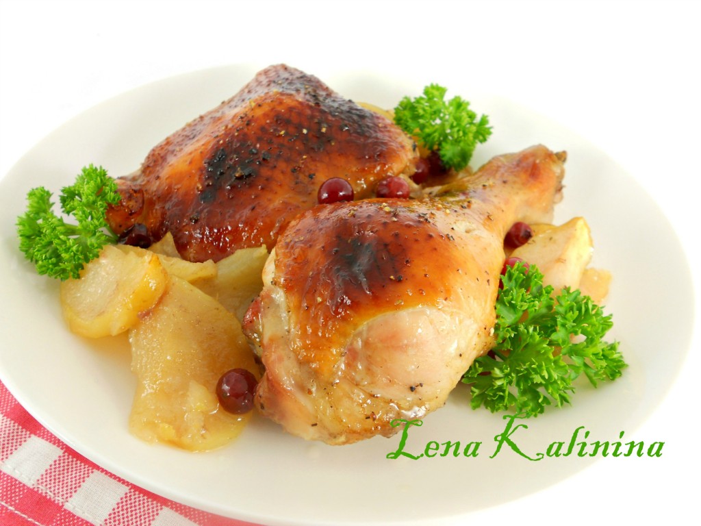 Необыкновенно вкусными получаются окорочка, запеченные в духовке с яблоками. Маринуются окорочка в маринаде с добавлением меда, и яблоки при запекании также им пропитываются. Из яблок можно сделать прекрасный соус к окорочкам, пюрировав их блендером. Попробуйте обязательно!