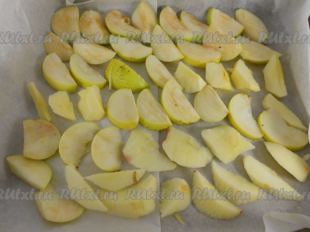 Из яблок удалить сердцевину и порезать дольками, выложить одним слоем на противень, застеленный пергаментом. Сбрызнуть лимонным соком.