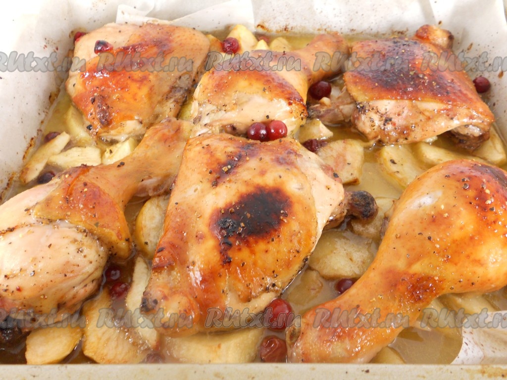 Сверху на яблоки выложить окорочка вместе с маринадом. Добавить горсть клюквы.