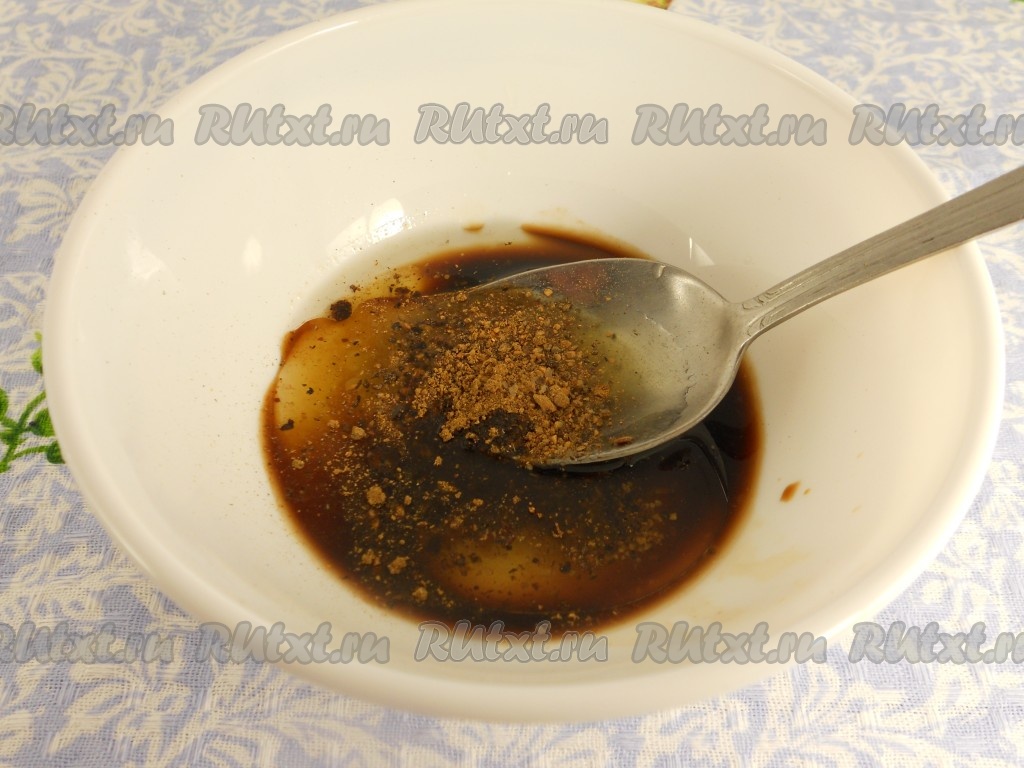 К соевому соусу добавить бальзамический уксус и мед. Хорошо перемешать до однородности. Всыпать специи, влить растительное масло и еще раз перемешать.