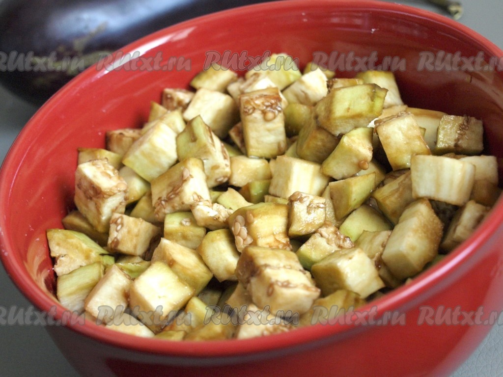 Баклажаны, очищенные от кожуры, режем кубиками, солим и оставляем минут на 30-40.