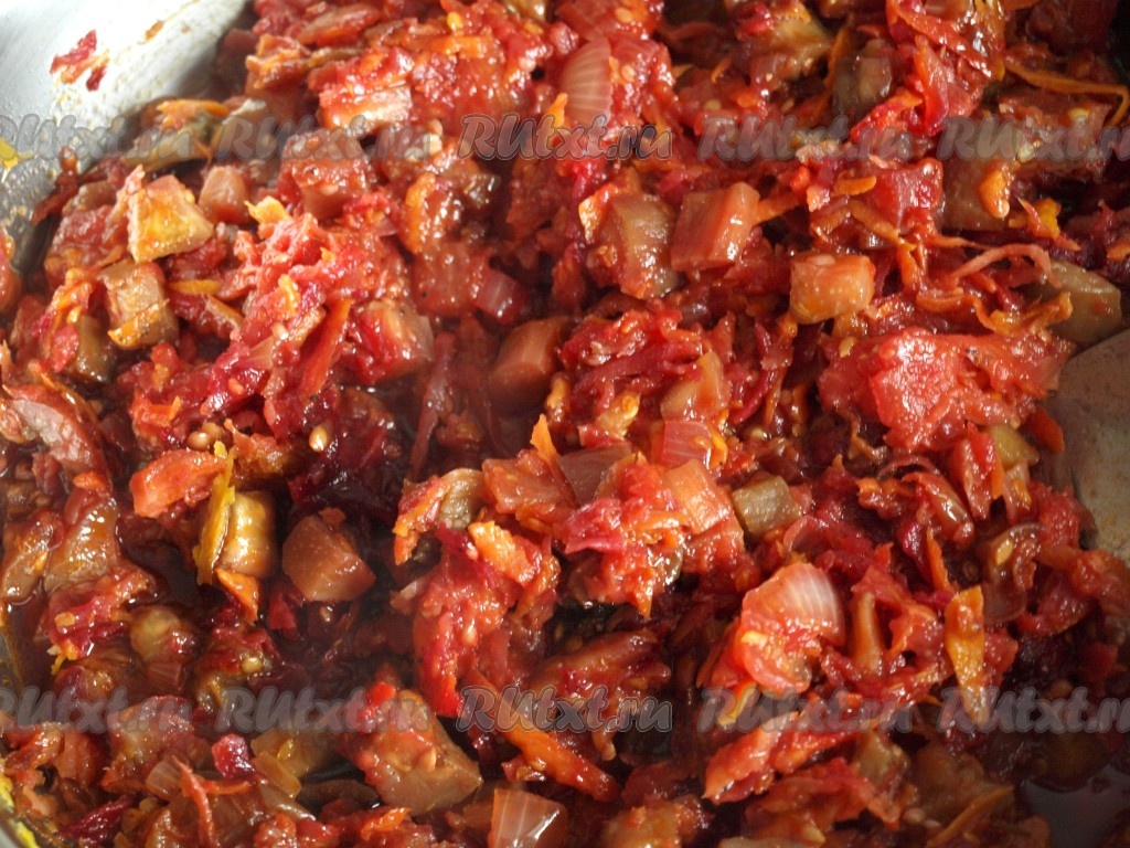 На сковороде с разогретым растительным маслом обжариваем лук с морковью, затем отжимаем баклажаны, добавляем на сковороду и обжариваем вместе. Затем к обжаренным овощам добавляем свеклу, посыпаем её сахаром, перемешиваем. Снимаем с помидоров шкурку и перекручиваем на мясорубке или в комбайне. На сковороду отправляем томатную массу, порезанный болгарский перец, соль, перец, перемешиваем и готовим зажарку 5-7 минут.