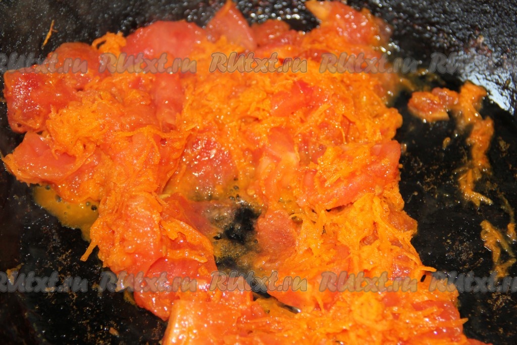 В сковороде обжарить на растительном масле порезанную луковицу, натёртую морковь, очищенные от кожуры и нарезанные помидоры, томатную пасту. Готовить до мягкости овощей.