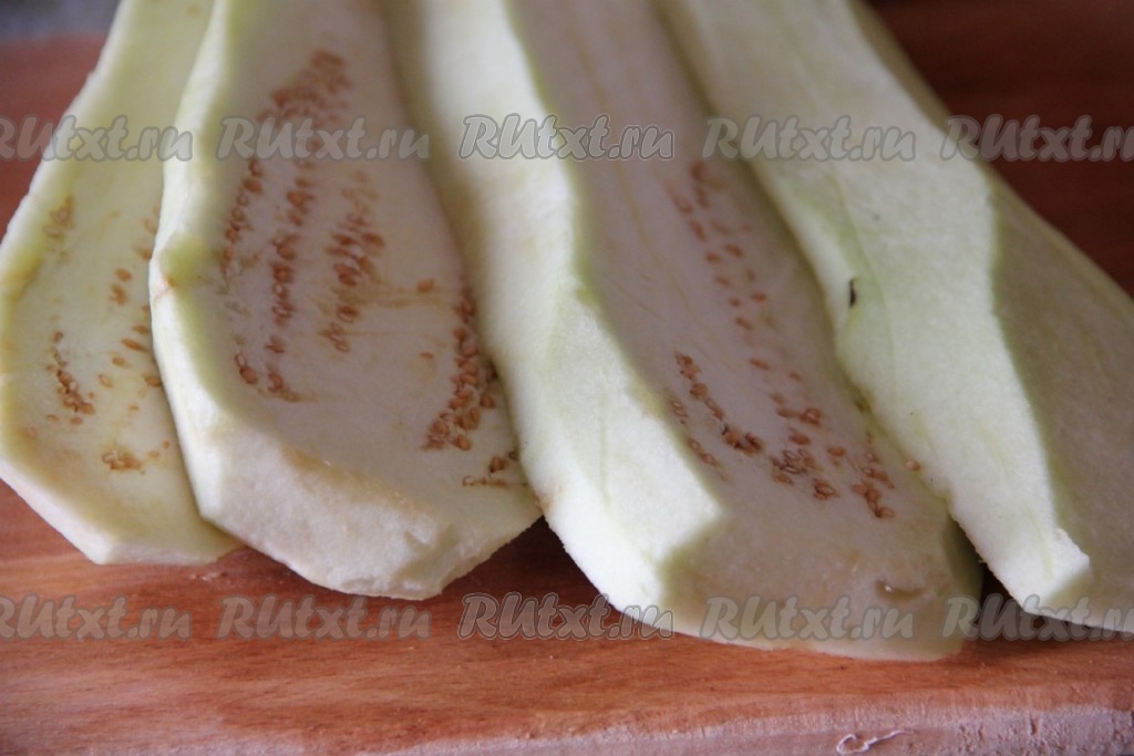 Баклажаны очистить от кожуры и разрезать вдоль на 4 части.