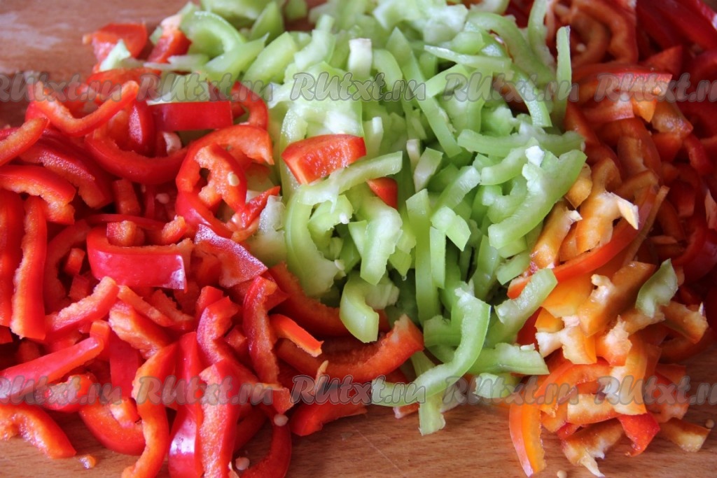 Болгарский перец очистить от семян, промыть водой, нарезать на полоски. Я взяла перцы разных цветов, поэтому готовая закуска получилась не только вкусной, но и очень аппетитной.
