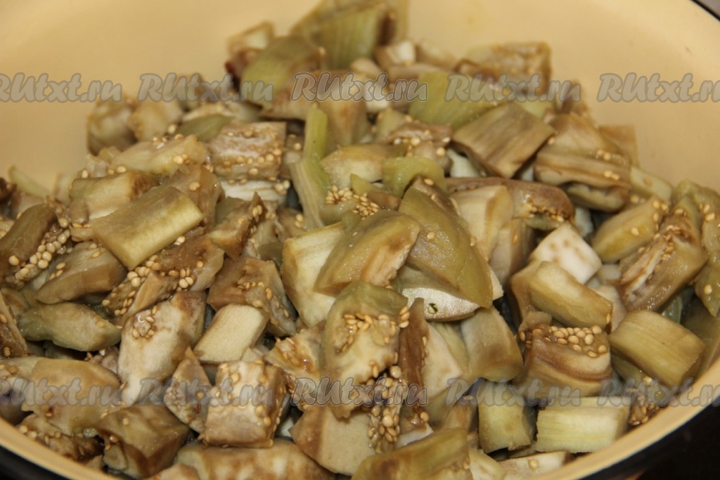 Затем достать баклажаны из воды, дать им остыть. Нарезать баклажаны на средние кубики.