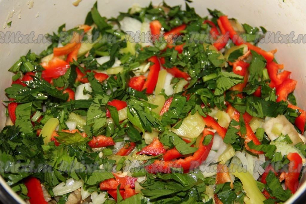 В кастрюлю выложить слоями баклажаны, лук, болгарский перец и зелень, между слоями выдавливать чеснок.